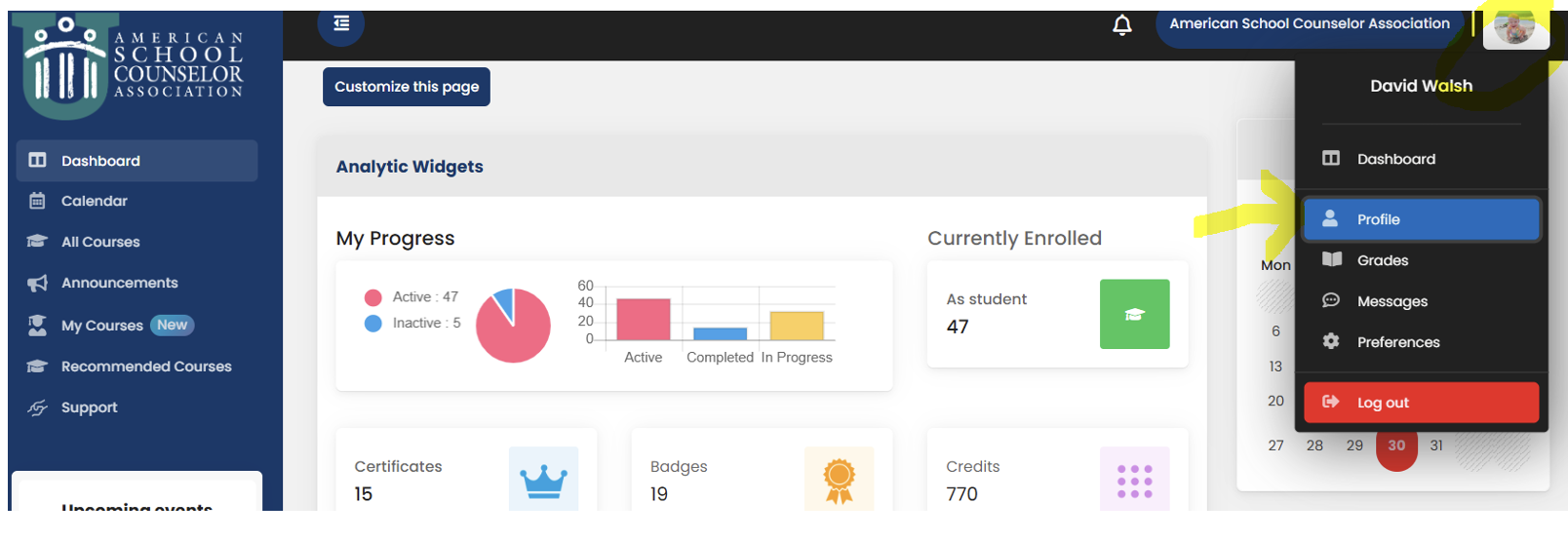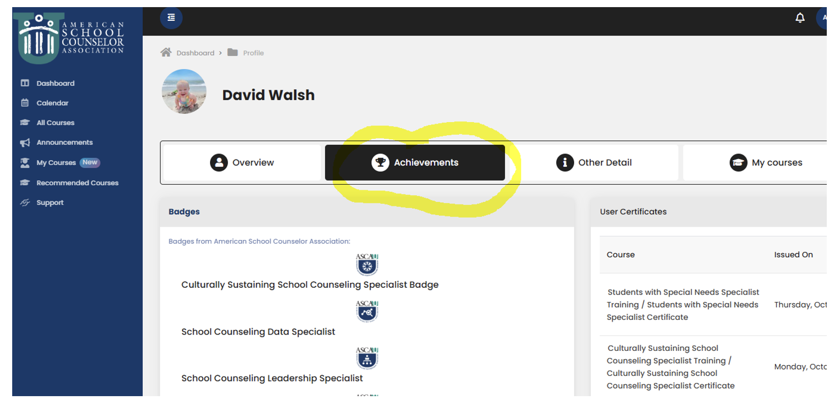 You can download a transcript by logging into ASCA University and clicking on your Profile from the top right drop down. From there, click on your Achievement tab. From there, you’ll see a section “User Certificates” where you can print your digital certificate (see screenshot below).