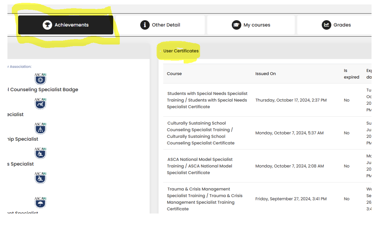 You can download a transcript by logging into ASCA University and clicking on your Profile from the top right drop down. From there, click on your Achievement tab. From there, you’ll see a section “User Certificates” where you can print your digital certificate (see screenshot below).