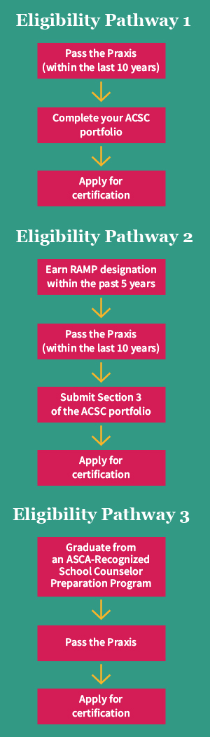 To qualify for certification, school counselors must meet one of the three eligibility requirement pathways outlined to the right. (Note that Praxis refers to the Professional School Counselor Praxis Test.)